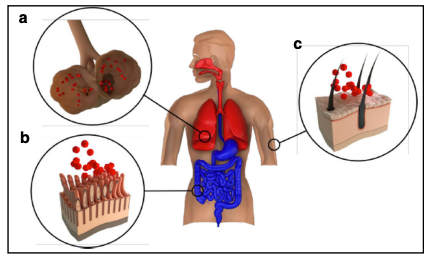 “Pictorial representation displaying the three primary paths of human exposure to NPs, i.e., via A lungs, B gastrointestinal (GI) system, and C skin.”