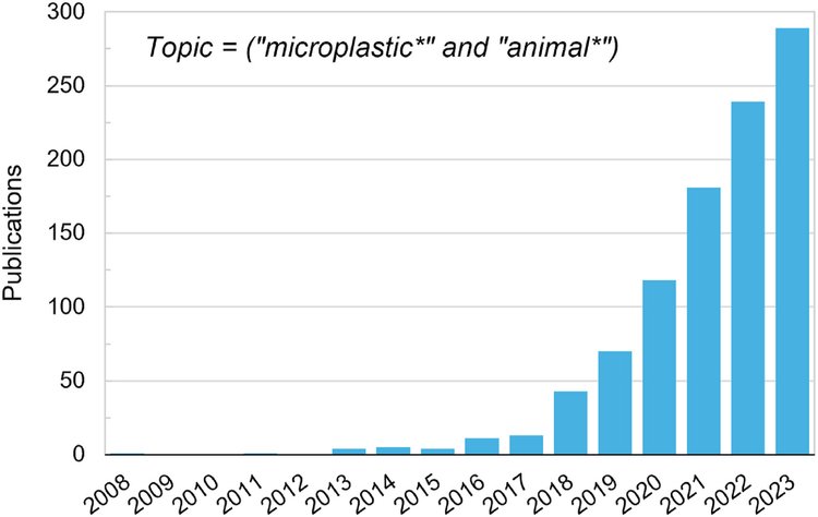 Over the past 10 years, interest in microplastic consumption has grown exponentially as its health repercussions become more apparent. Figure 2 displays the number of yearly publications that include the words “microplastic” and “animal” since 2008.